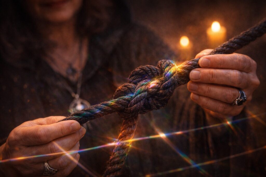 Choose a cord (black, deep violet, or iron-gray) and name the exact harm you are stopping. Hold the cord in both hands and speak one clear sentence: “Your access to me ends here.” Then tie nine knots, each knot a clause that narrows scope.