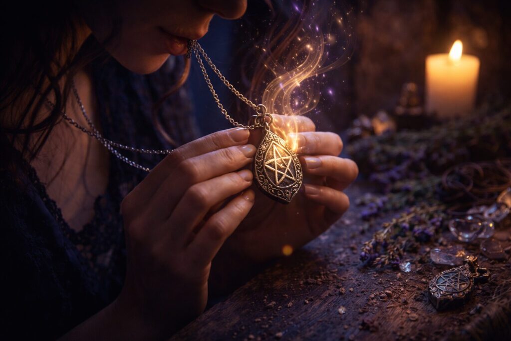 Charging a silver pendant beneath the full moon, then sealing it with herbs and smoke so it carries a clear protective current for daily wear.