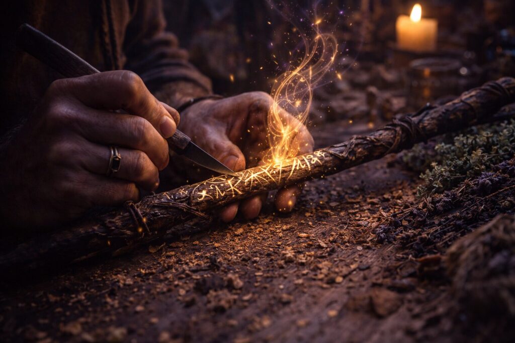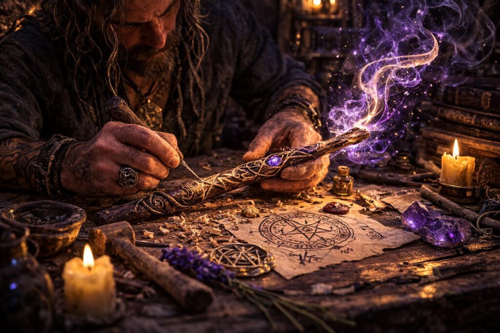 Some of the deepest enchantments are not placed into purchased tools, but into objects shaped slowly by the practitioner’s own hands. A wand carved from chosen wood, a ritual spoon, a talisman wrapped and stitched, a pendant assembled with carefully selected components, or a charm bag layered with herbs and symbols may hold a different quality of intimacy because the making itself becomes part of the magic. Craft and enchantment begin to overlap. The object is not merely selected for use; it is formed in relationship from the beginning.
