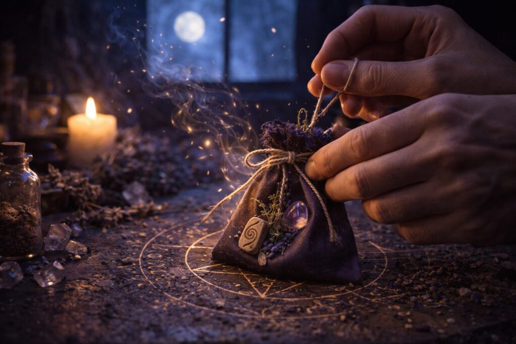 Creating a small charm bag of herbs, stones, sigils, and soft prayer for restful sleep, then refreshing it regularly to keep the pattern bright and true.