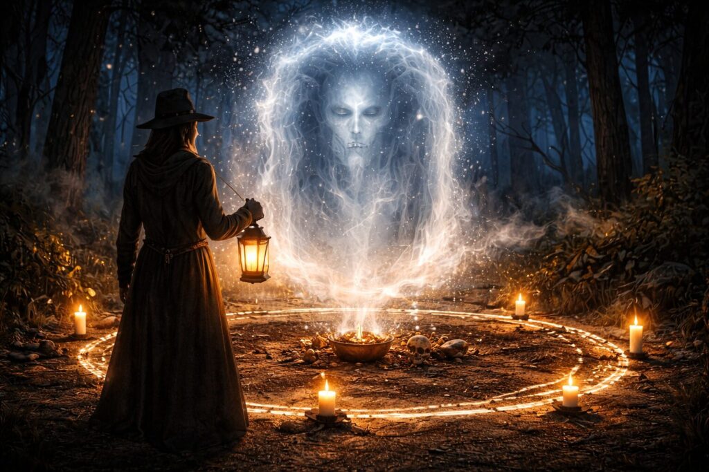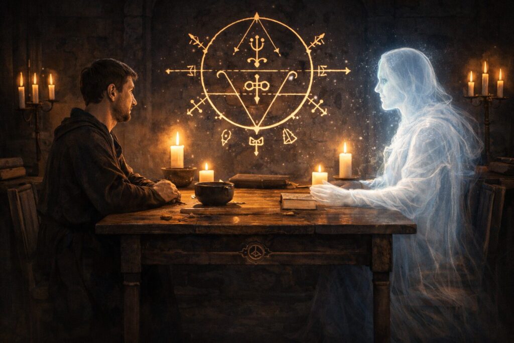 A spirit may be called not into open air, but into a bowl of water, dark mirror, statue, skull, lantern, or other designated vessel through which manifestation is focused. This approach can sharpen the encounter and create a more stable place of communication, but it also requires clear agreements, proper containment, and a well-defined ending once the work is complete.