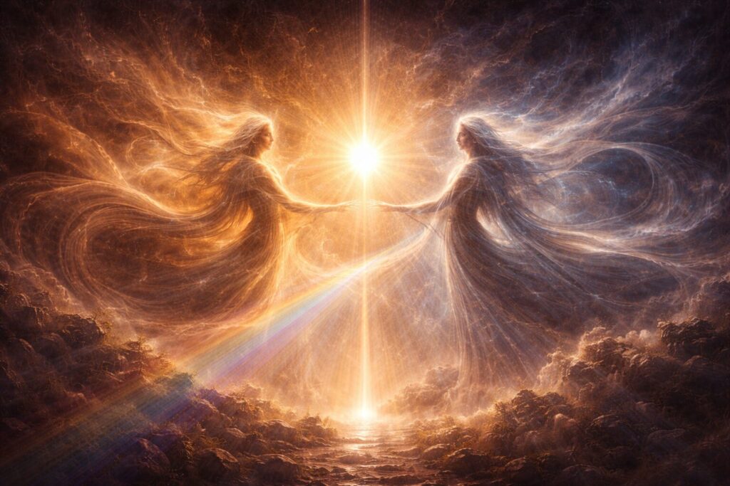 In the beginning there is not yet personhood, not yet story, not yet devotion—only the deep, unformed field from which all things may eventually arise. But the deep does not remain undifferentiated forever. Darkness gathers. Light emerges. Shadow is cast. Tension appears where one state meets another, and the threshold is born.