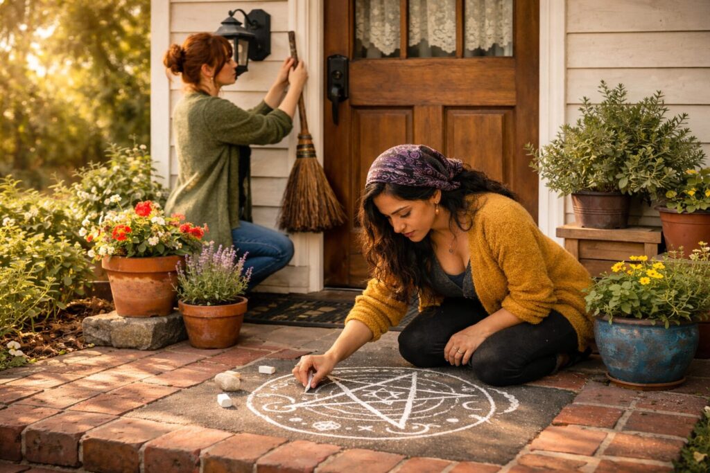 Salt at the doorway, iron near the threshold, garlic in the kitchen, protective sigils drawn in chalk, or a broom placed beside the door all function as boundary markers. They signal that the home is spiritually tended and not left unguarded.