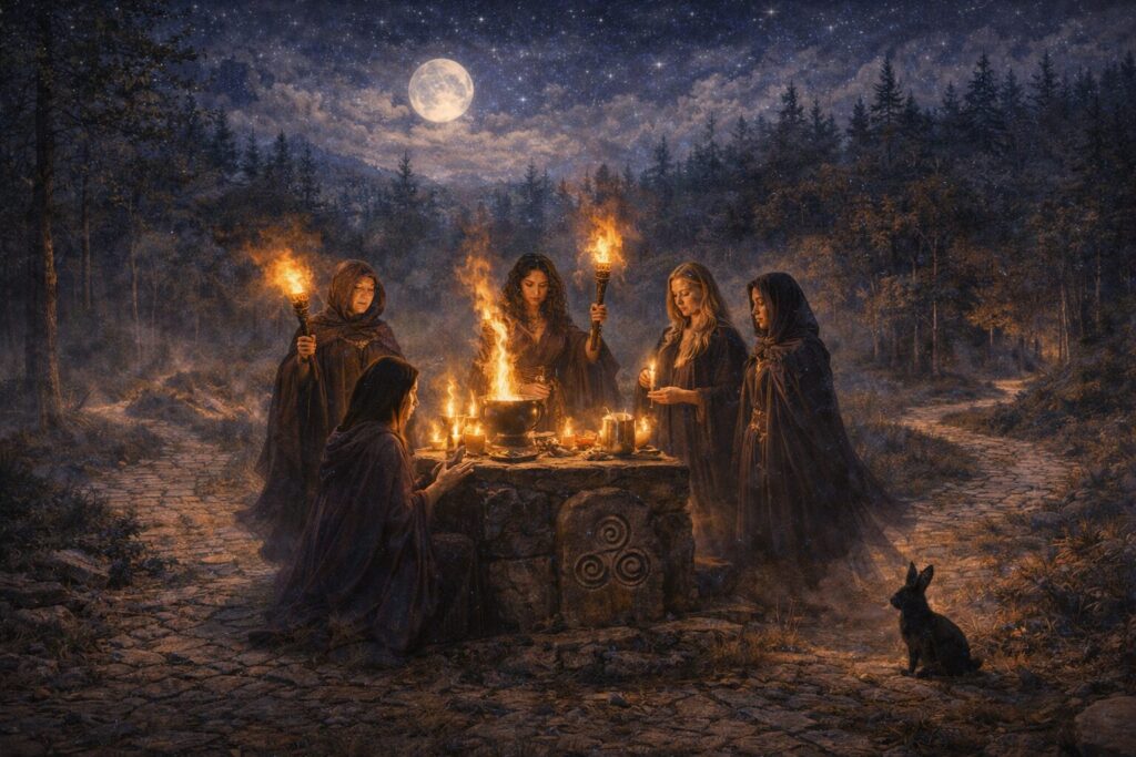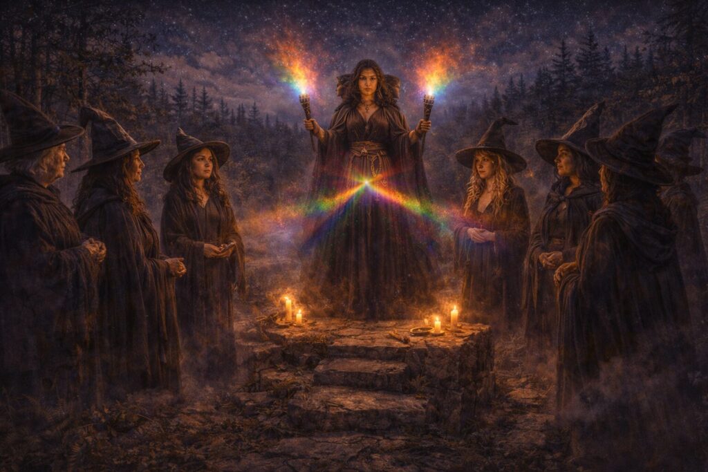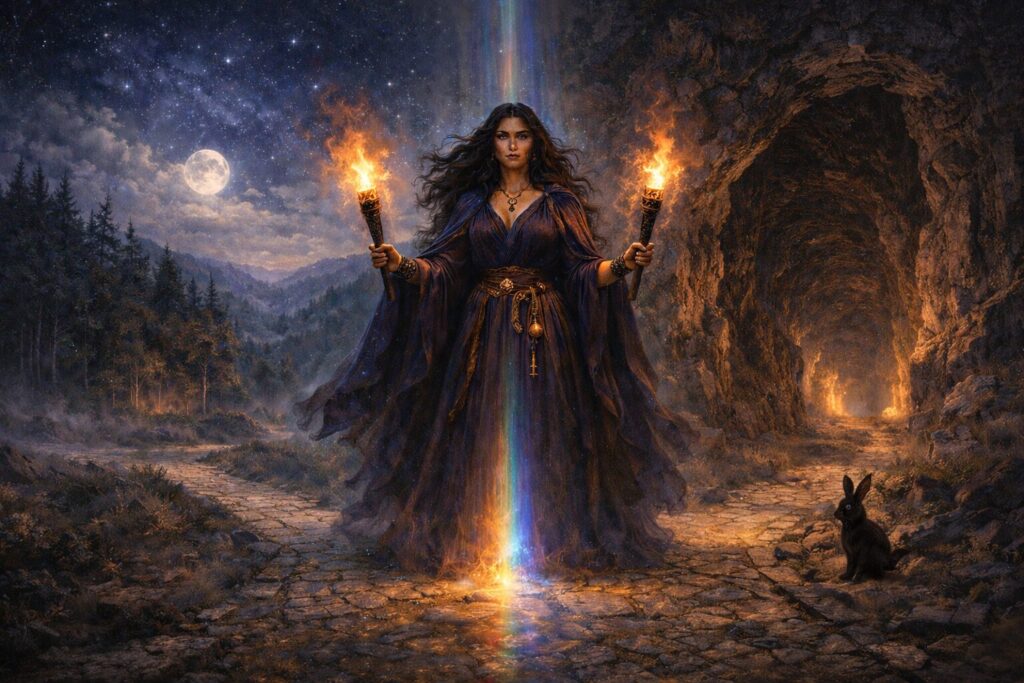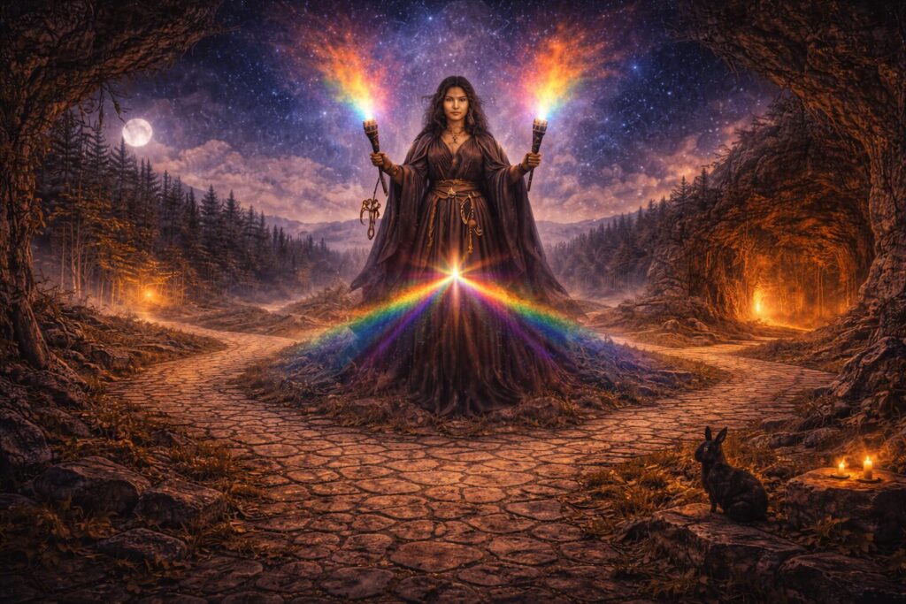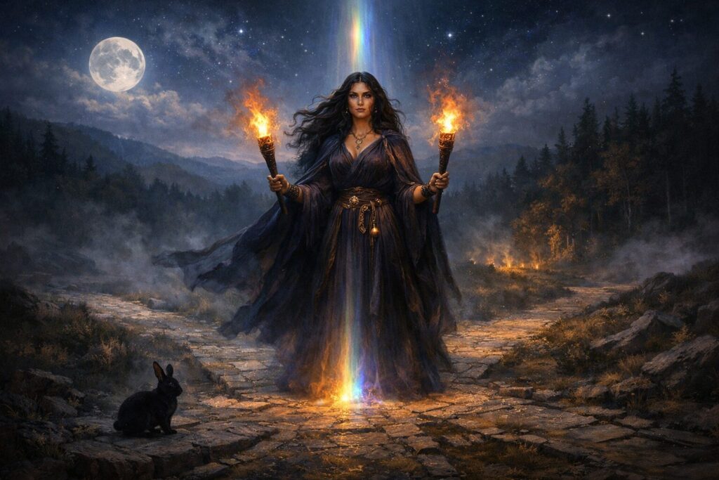 In this sense Hekate’s role in witchcraft is profoundly initiatory. She does not simply help someone perform magic; she transforms how that person understands the world in which magic operates. Through her influence the practitioner learns to recognize thresholds everywhere—in the psyche, in ritual space, in moments of decision, and in the unseen layers of reality itself. The witch becomes not merely a user of techniques but a walker of hidden roads.