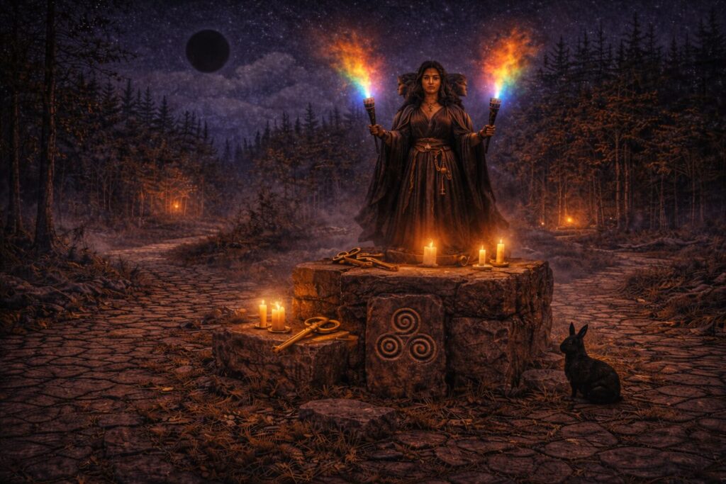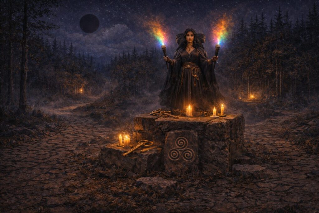 To walk with Hekate, then, is not simply to admire mystery. It is to accept that the hidden is real, that the shadow contains knowledge, that thresholds demand reverence, and that magic belongs to the structure of existence itself. She stands with keys in hand and torches raised, not to remove darkness, but to teach us how to see within it. She is the witch queen of the crossroads, the guardian of passage, the keeper of secret ways, and one of the great gods through whom the deeper pattern of creation may be approached.