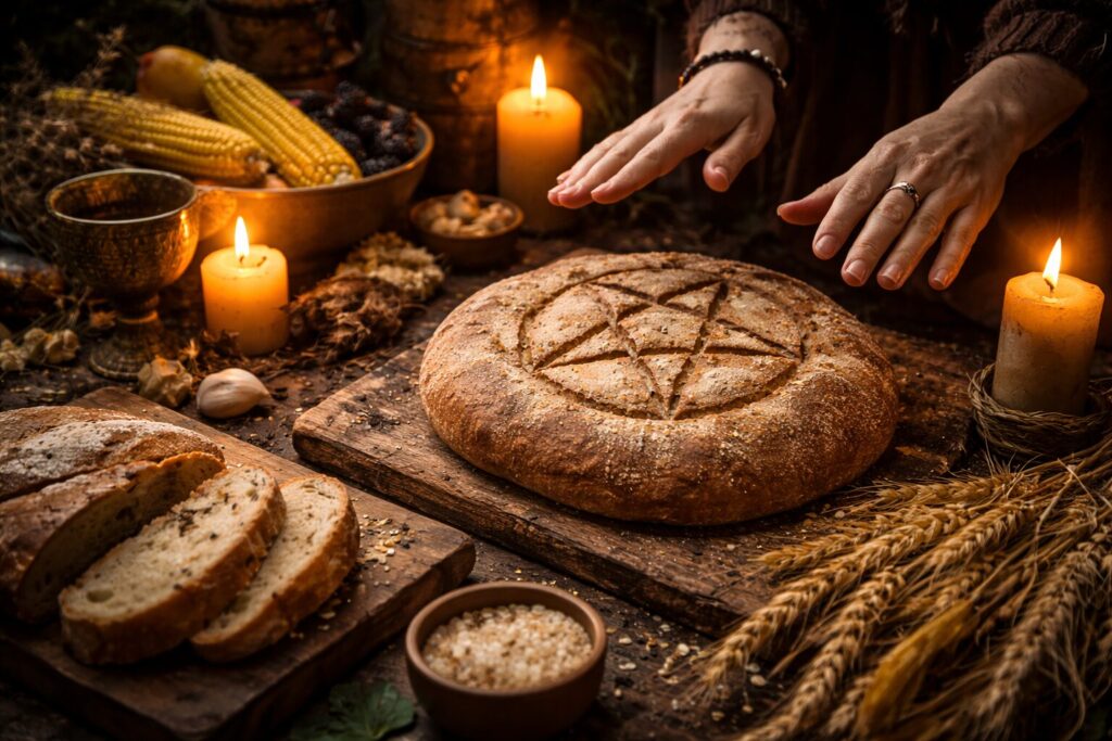 | Folk Catholic / Syncretic Loaf Mass (Lammas) β’ harvest blessings β’ regional grain customs | Lammas / Harvest Blessing Bread blessing; prayers for stores and household | Home devotion β blessed bread, prayers of thanks, and practical acts of charity and sharing. | Gratitude as devotion; blessing the household; sharing the harvest; humility and care in abundance. |