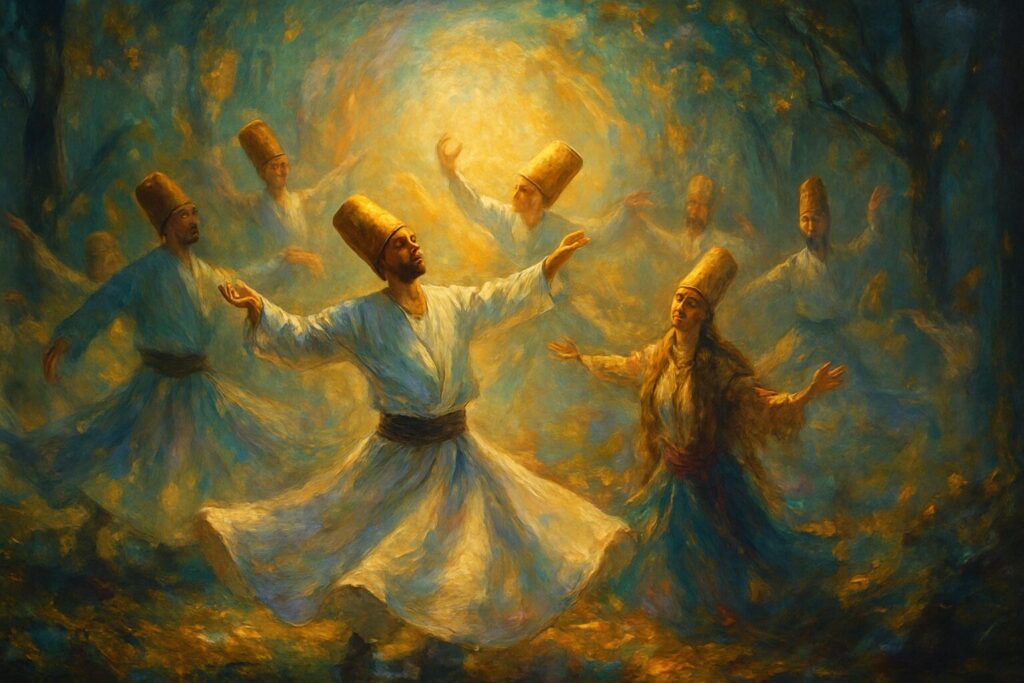 Mystical practice manifests in many forms: the stillness of contemplation, the fire of ecstatic dance, the austerity of fasting, the flight of vision. The Sufi whirls, the monk kneels, the witch drums at the crossroads. All seek the same opening, the dissolution of separation. Mysticism is not a set of techniques but a disposition—a readiness to be unmade and remade by the divine.