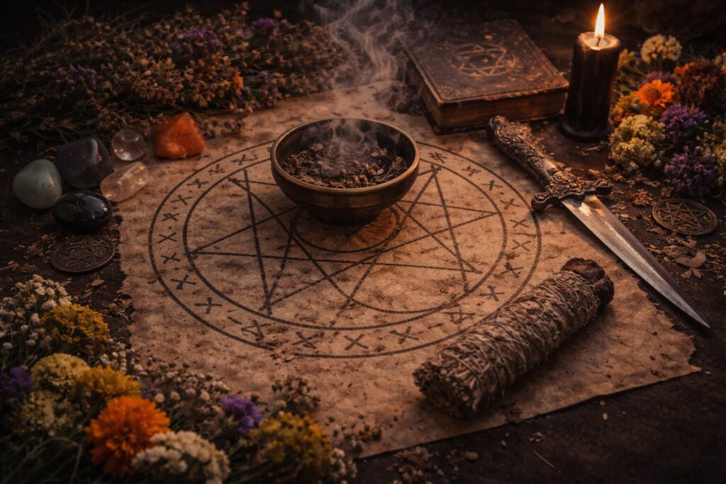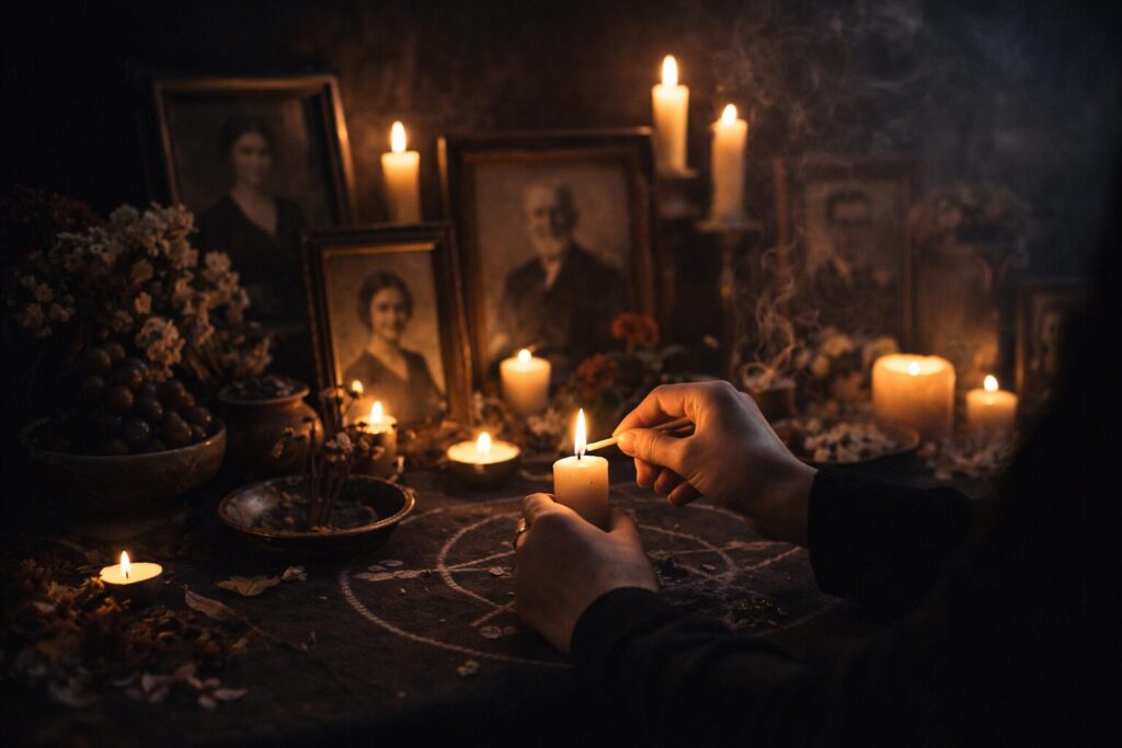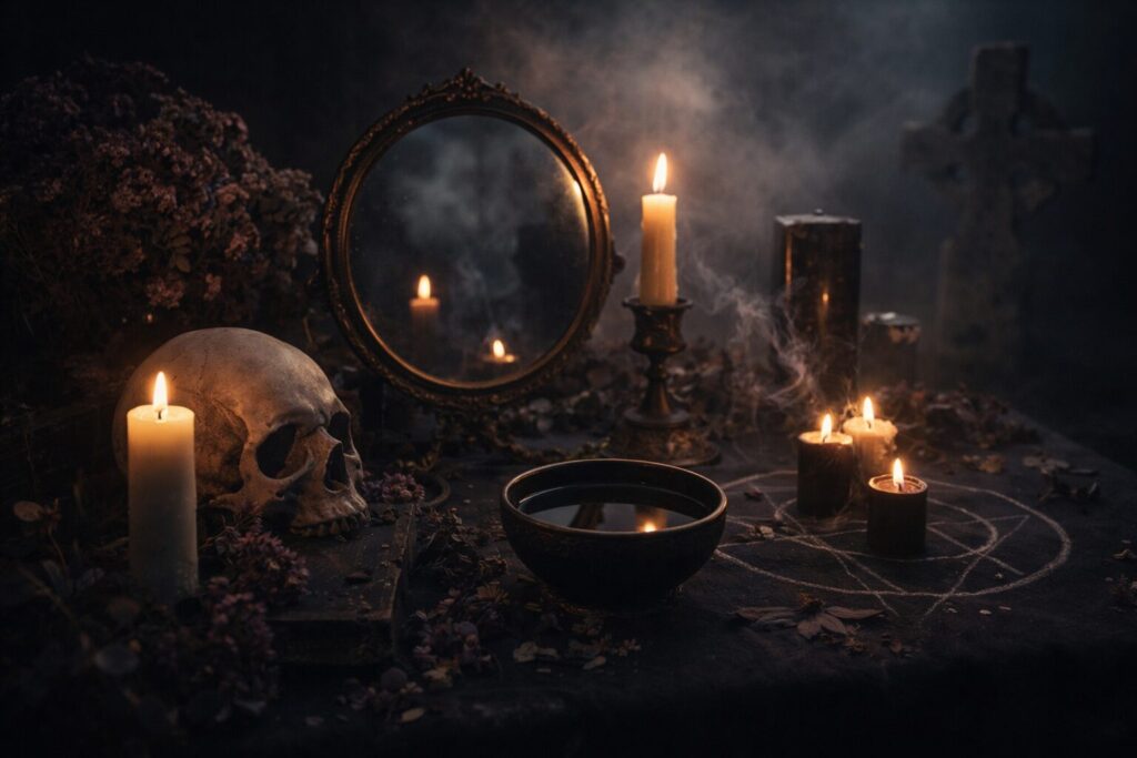 Necromantic work may be done at a home altar, in a ritual circle, at a grave, beside ancestral photographs, or in places where memory and death are strongly held.