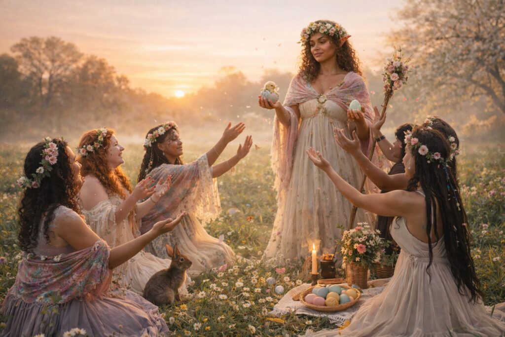 Many modern Pagans connect Ostara to Eostre/Ostara, often framed as a spring or dawn-associated figure in Germanic contexts. Some treat this as devotional myth; others as seasonal poetry; others focus on equinox balance without deity emphasis.