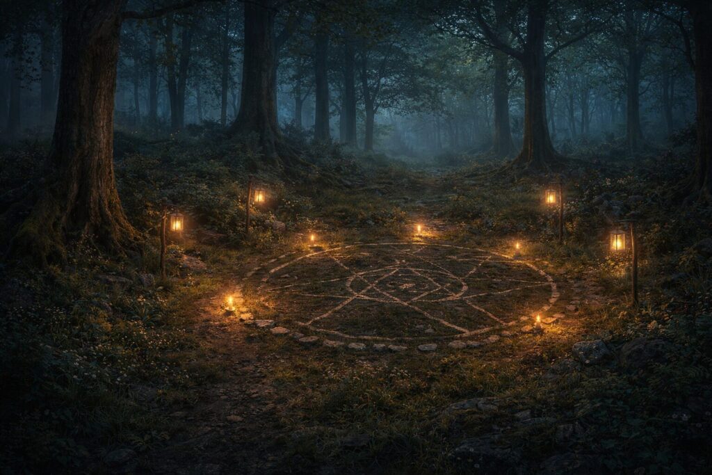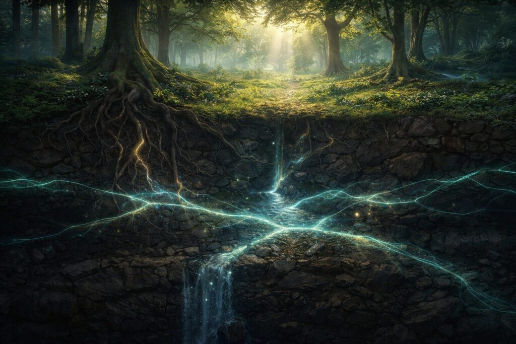 This page holds both sides of the subject: the cosmology of place and the practical methods of working with it. We will map the ways a site becomes sacred or magical, the ways fairy-threshold geography tends to cluster around edges and old boundaries, the ways energetic grids (ley lines and related systems) overlay the landscape, and the ways places can become tainted or “cursed” through trauma, neglect, or deliberate binding. Just as importantly, we’ll cover ethics: how to approach a living land respectfully, how to make offerings without entitlement, how to enchant a place without colonizing it, and how to recognize when the wisest magic is to leave a threshold undisturbed.