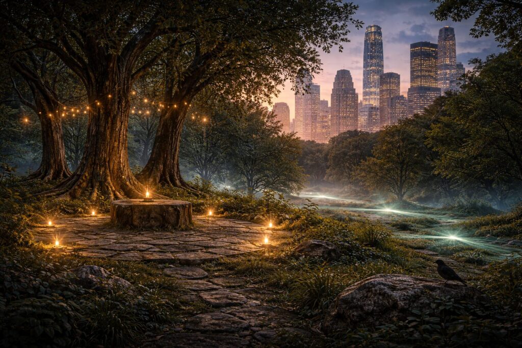 Urban environments are not spiritually dead zones; they are louder ecosystems. Cities contain grid crossings, convergences of human will, density of thought, and centuries of layered narrative. A small park can hold the atmosphere of a sacred grove. An alley shrine can pulse with devotion. A bookstore can become a node of shared intention. The scale changes, but the principle does not: repetition builds field.
