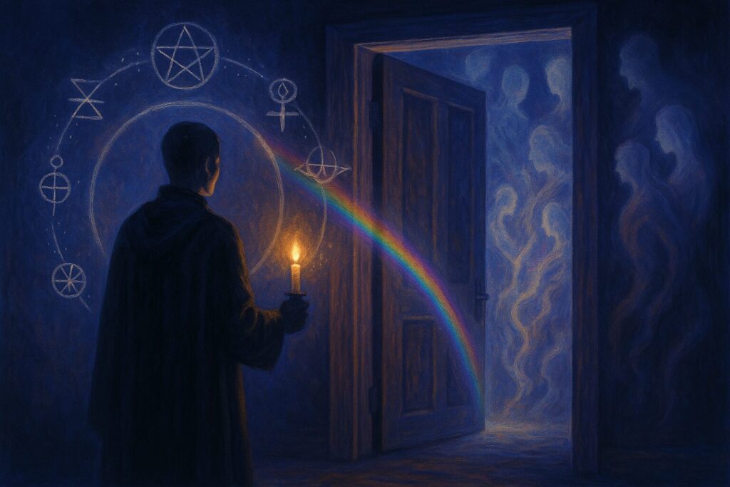 By the late nineteenth century, the current of Spiritualism began to mingle with another: the revival of Western esotericism. Theosophy’s founders, Helena Blavatsky and Henry Olcott, emerged from Spiritualist circles before reaching eastward for new cosmologies. The Hermetic Order of the Golden Dawn, though more structured and occult, inherited Spiritualism’s techniques of trance, invocation, and the consecrated circle. In the early Wiccan revival of the mid-twentieth century, Gerald Gardner retained the pattern almost intact—the casting of the circle, the calling of spirits, the belief in familiar or guardian presences.