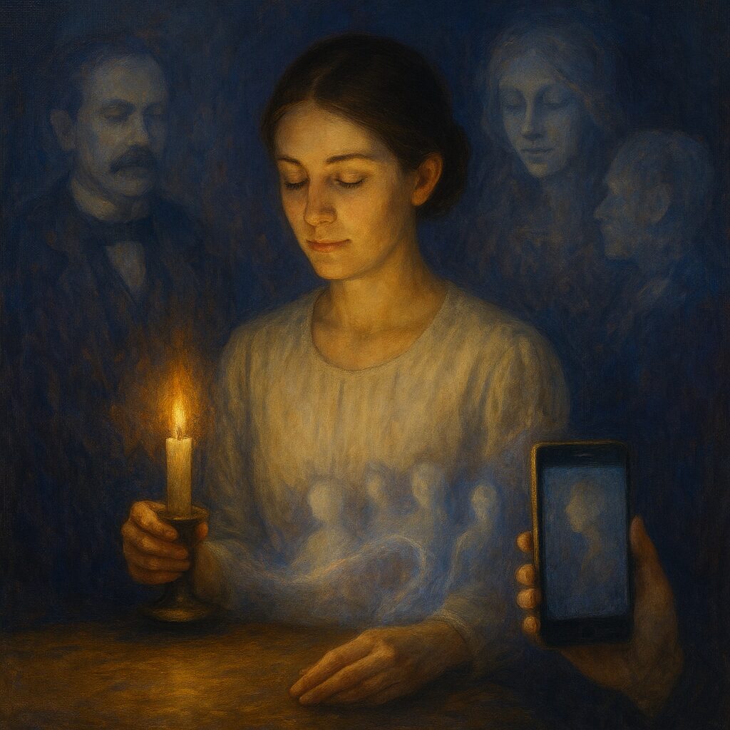 Spiritualism’s populism also anticipated our age of individual revelation. Online psychic communities, social media mediums, and intuitive practitioners continue the same experiment—each attempting to bridge the gap between seen and unseen. What was once parlor ritual now thrives in livestreams and digital circles. The medium’s cabinet has become a glowing screen. Yet beneath the new forms, the essence remains: the longing to listen, to connect, to know that love endures.