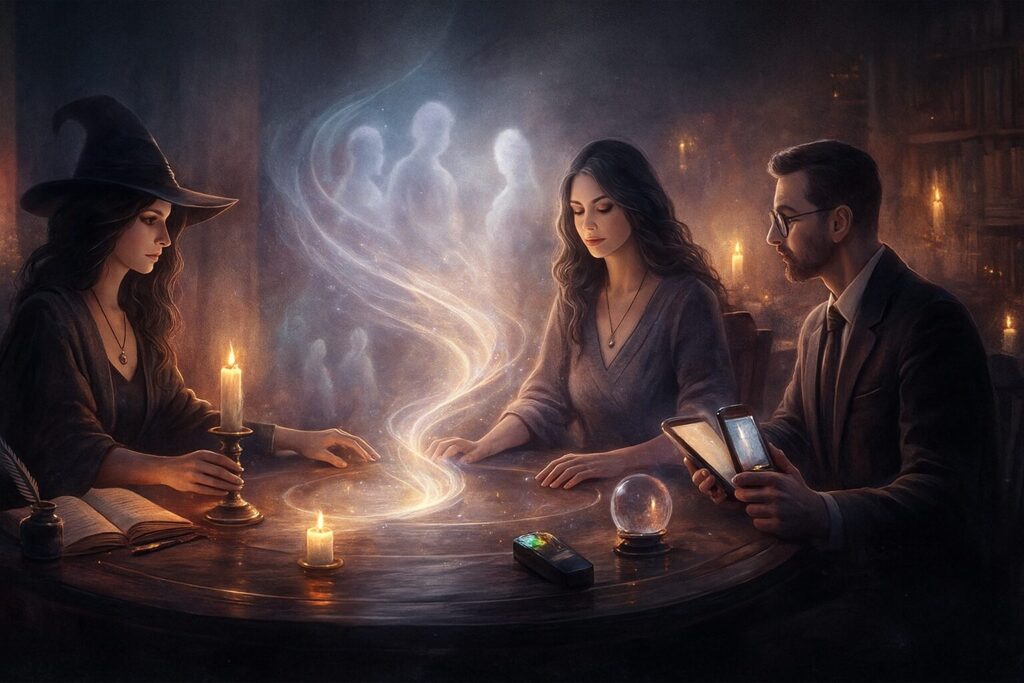 The witch, the psychic, and the scientist share the same impulse: to ask the darkness a question and to wait for its reply. Spiritualism taught that such inquiry need not divide us—that faith and reason can sit at the same table, hands lightly touching, hearts open. It gave voice to the voiceless, dignity to grief, and a method to mystery.