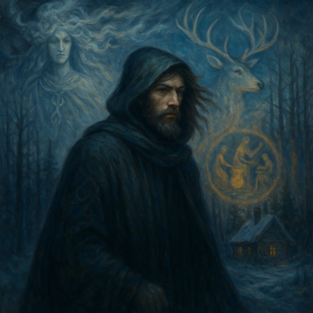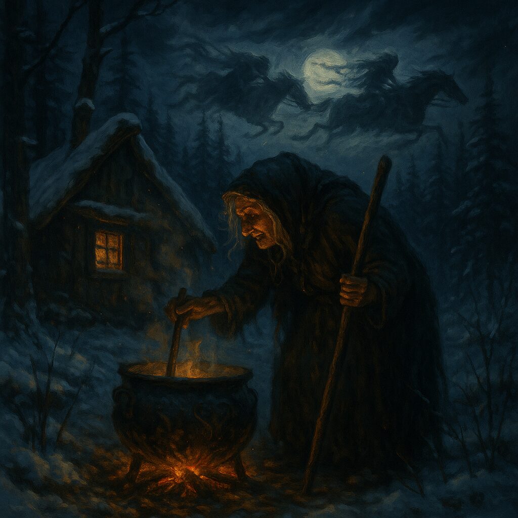 But memories twist in the telling, especially when new powers rise. As Christianity spread, these winter queens were too powerful to erase, so they were reduced instead. They became haunting hags, or dangerous old women who punished children or wandered the cold roads. Shorn of their divinity, they remained in the culture only as echoes — crooked outlines, recolored by fear. When the witch of folklore appears hunched in a forest cottage, stirring a pot, muttering at the hearth, she carries the faintest shadow of those seasonal rulers whose judgments once guided whole villages.