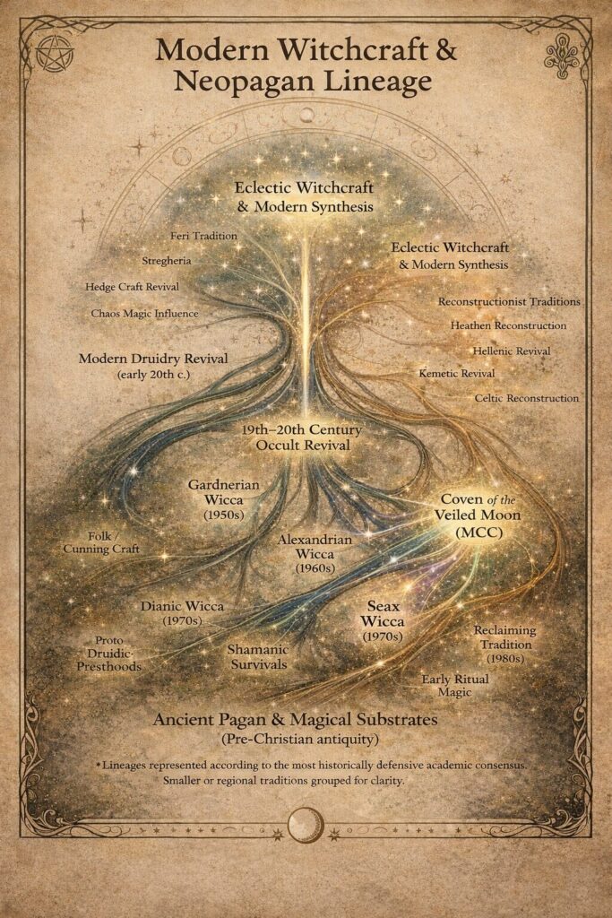 Because this page is focused on how witchcraft is actually organized, transmitted, and taught, the traditions below are arranged by historical lineage, structure, and method rather than aesthetic labeling. Colors can be playful shorthand; traditions are the frameworks that carry practice across generations.