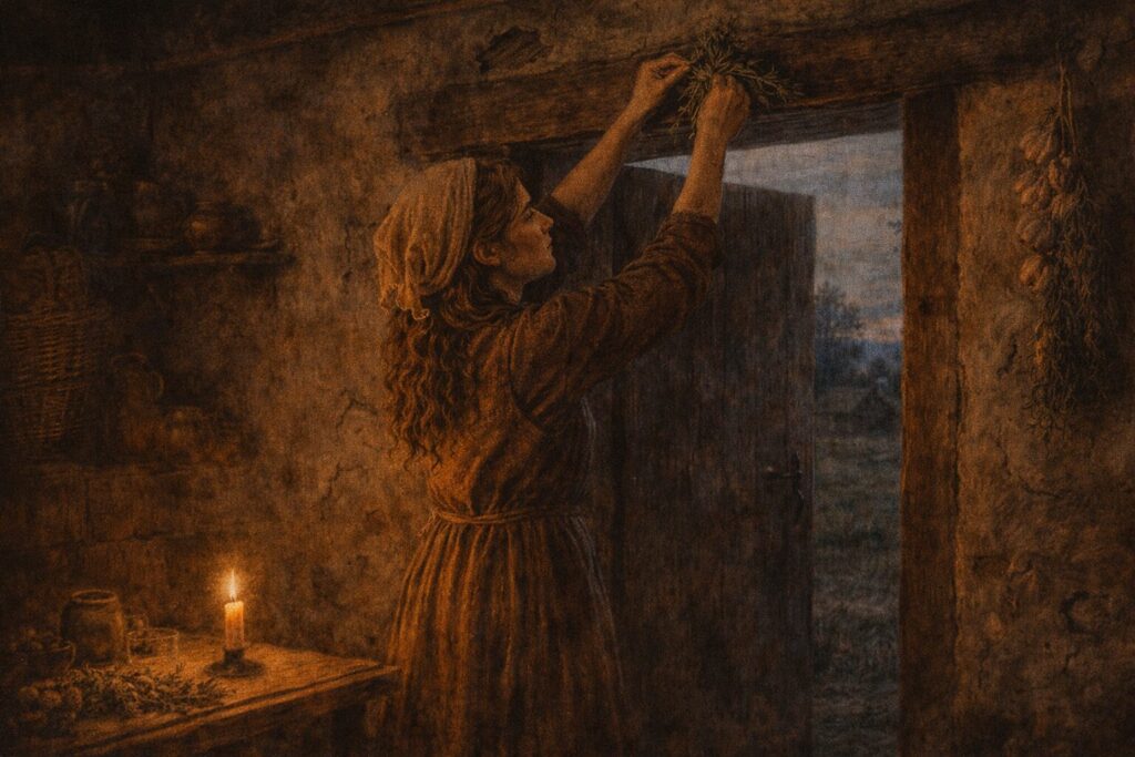 Protective signs, bundles, salt, iron, candles, and gestures of blessing reveal how often the craft survived as the art of guarding the home.
